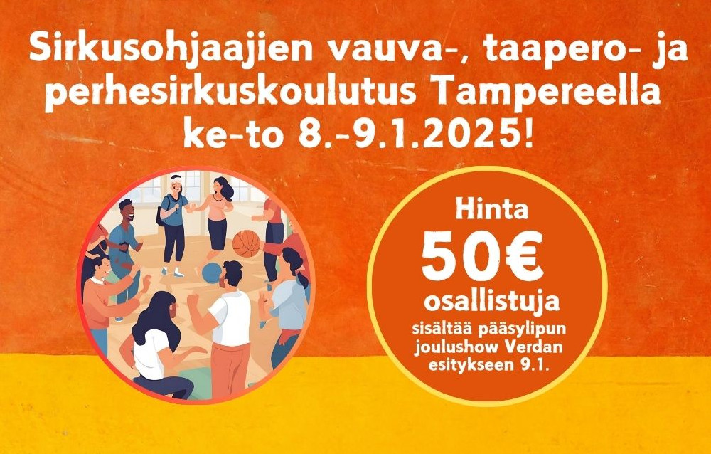 Koulutus on pitkään odotettu osaamisen vaihtoon ja uusien menetelmien haltuunottoon tähtäävä workshop. Kahden päivän aikana fasilitoimme ja koulutamme kokonaisuuden, jossa opimme uutta, saamme jaettua kokemuksia erilaisista menetelmistä ja tutkimme eri variaatioita suhteessa aiheeseen! Odotamme siis osallistujilta vähintäänkin sirkuksen opettamisen/ohjaamisen kokemusta, mutta kokemus vauva-, taapero- tai perhesirkuksesta ei ole haitaksi.